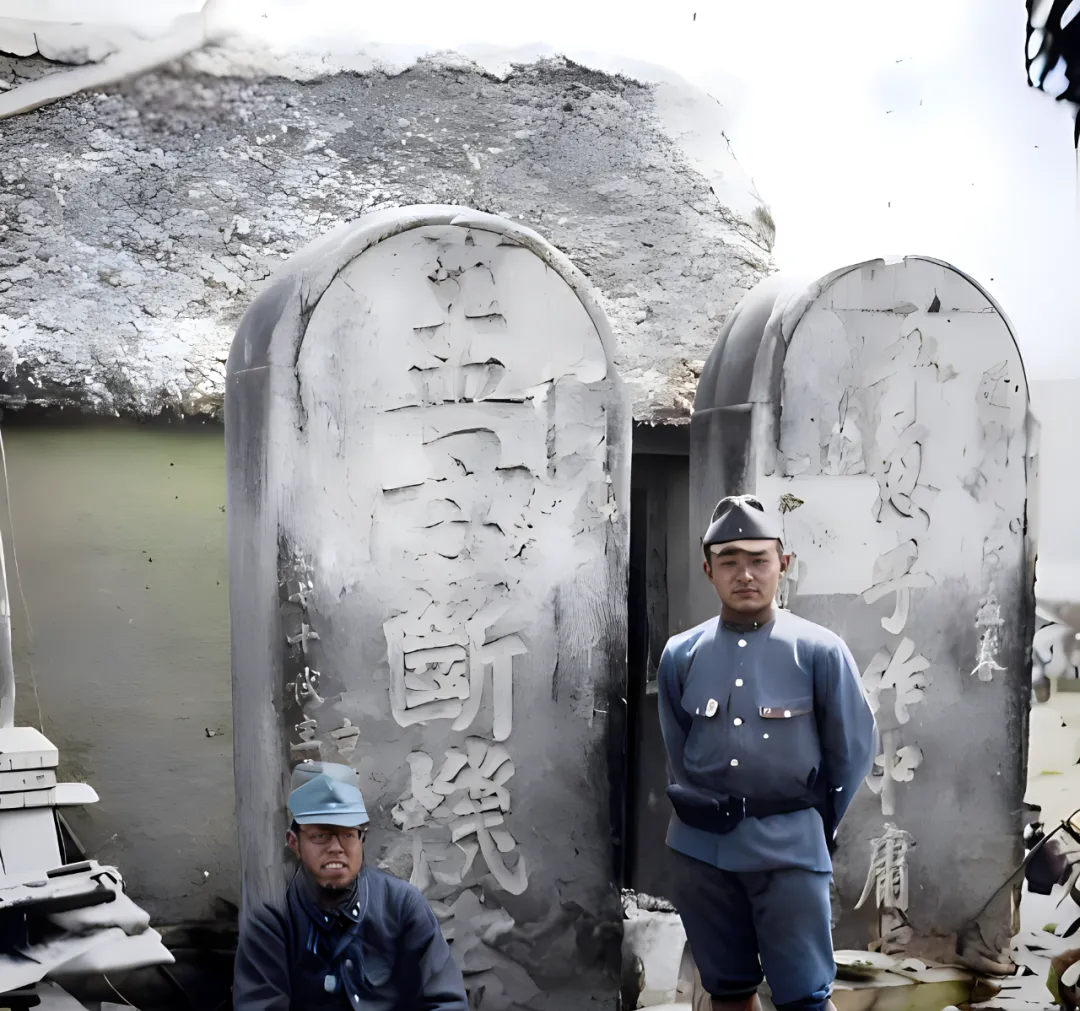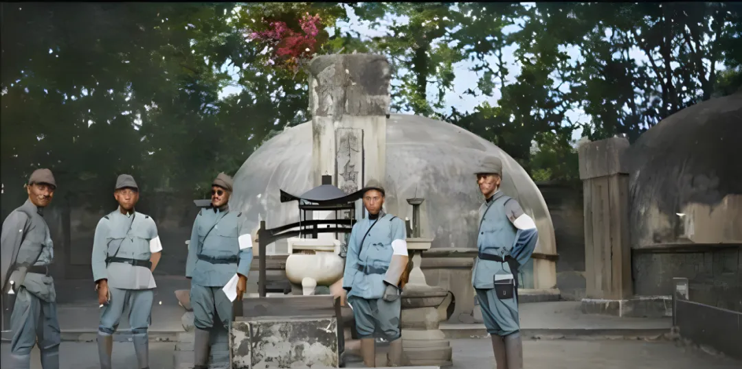 这处圆顶墓冢前,几名穿灰蓝军服的人散开站着,袖口贴着白布,腰间挎袋吊得歪歪的,石台上摆着香炉烛台,背后碑柱上风化得一塌糊涂,颜色上去了,讽刺味儿更重了,树影斑驳,笑容却冷,奶奶看见就叹气,以前人讲忠义是写在骨头里的,偏有人跑来摆拍挑衅,这张照相片留下的不是风景,是脸面被踩过的记号。