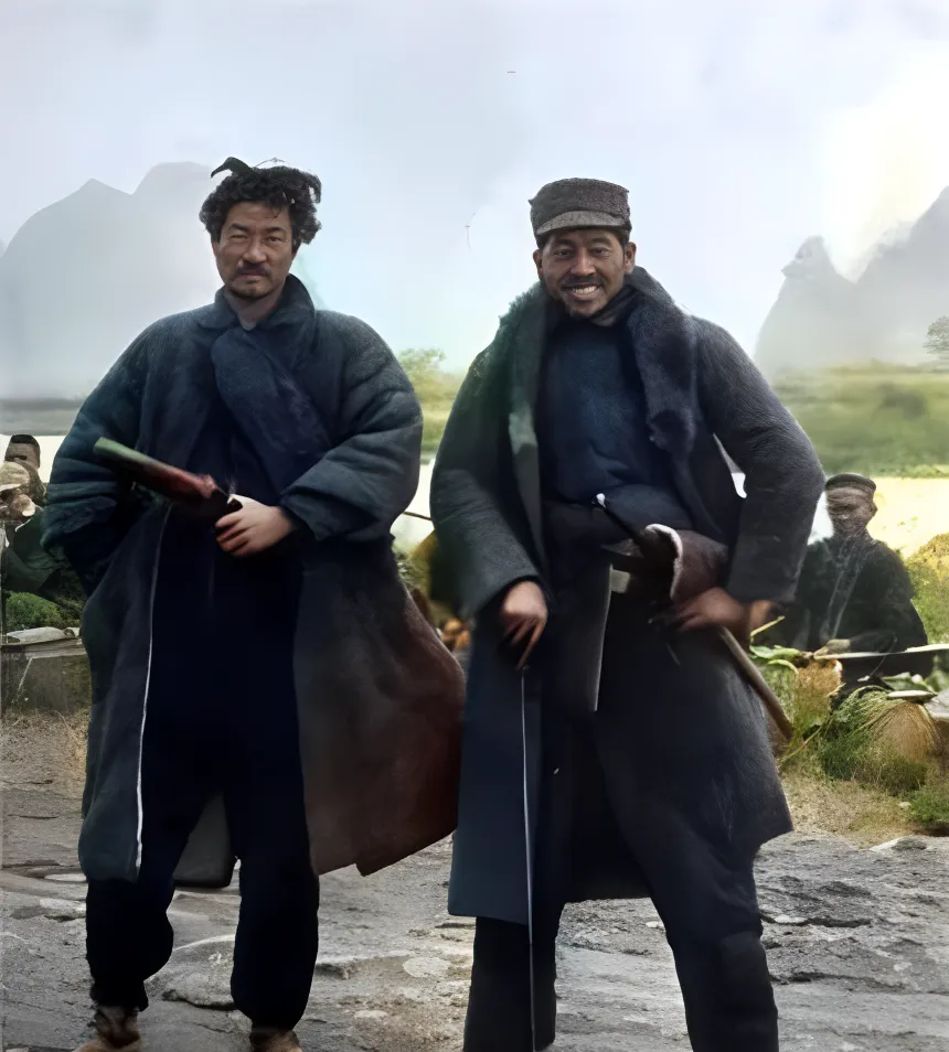 这两位穿着粗呢大氅的家伙,看着像边区常见的打扮,腰里却别着见不得人的刀,笑得随意,脚下的土路被踩出亮光,后头围观的人影模糊成一团,小时候我听外公提过,夜里站岗要看鞋跟、看刀鞘、看口音,真碰上伪装的家伙,心里咯噔一下,不能喊破,只能跟着吊着,再找机会通报,现在有定位有电台,那时候靠的就是耳朵和胆子。