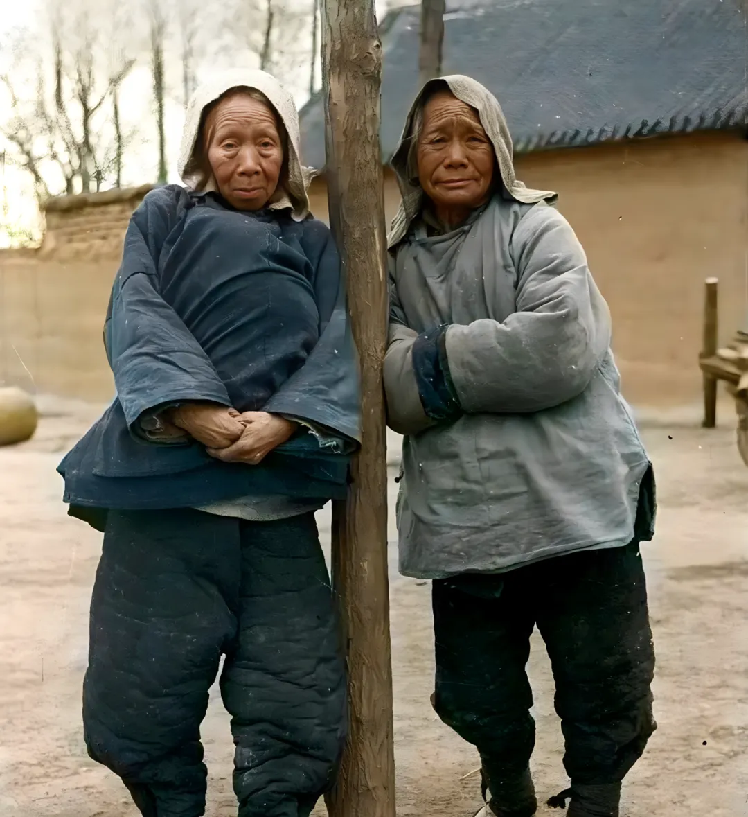 这个靠在木杆边的身影叫一路结伴的命,粗棉衣鼓鼓囊囊,袖子里塞着风,兜帽搭在头上,脸被寒气勒得发紧,左边那位把手臂死死夹在胸口,像护着什么,脚下泥地干裂,远处土墙斑驳,外婆说,四二年那阵子天旱粮紧,谁家有口热粥就算天大的福,照片里没哭没闹,只剩下站着的倔强,现在我们嫌羽绒服厚重,那时候人求的只是过得去的暖和。