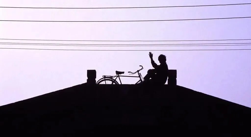 图中那辆老式脚踏车叫二八大杠,黑漆钢梁笔直,车铃一圈银亮,坐垫高高翘起,后货架能驮一袋米,这年头谁家有这么一辆,出门就有底气,屋脊线被傍晚拉成剪影,小伙子坐在瓦上朝街下招手,像跟朋友喊话,也像在跟青春告别。