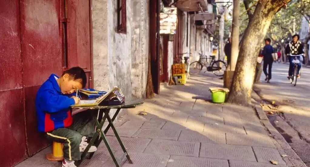 这个小折桌就是临时书桌,绿色铁脚,木板一掀就能收,凳子矮矮的竹节冒尖,孩子趴着写字,袖口磨得起毛,脚边一只塑料盆还在等人洗菜,妈妈从屋里探出头来嘱咐一句,写完就进来吃饭,凉了就不好吃了。