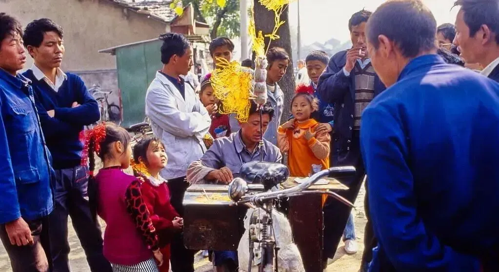 这摊叫吹糖人,铁炉子里糖浆咕噜翻泡,师傅两手一捏一吹,黄澄澄的龙就长出胡须,孩子们踮脚往里挤,袖口的红绒花一摇一晃,我小时候最盼的是师傅把多余的糖丝绕在竹签上,递给我说,小心烫,那甜味儿能从牙缝里一直甜到晚上。