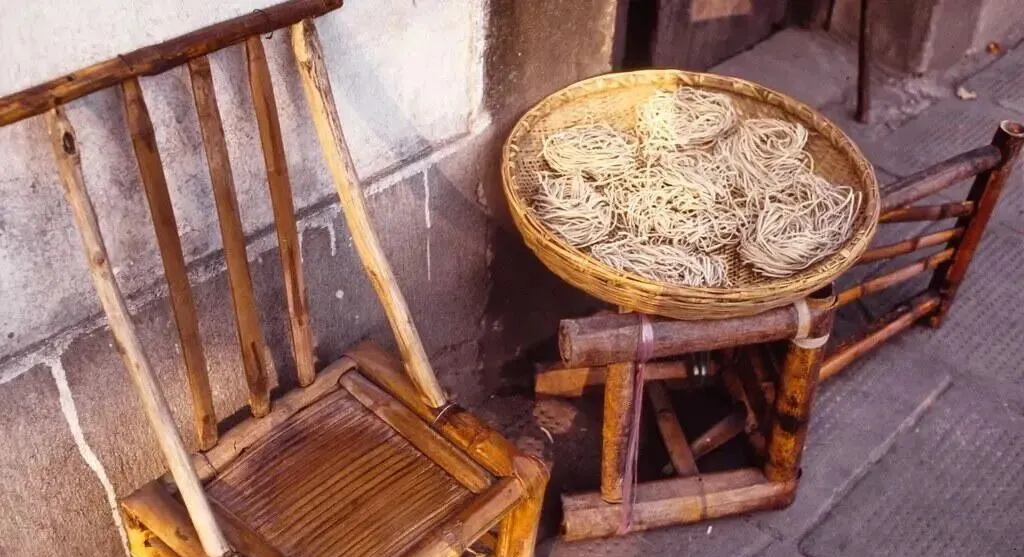 这个圆口竹编叫簸箕,边沿用篾条扎得紧,簌簌的面条盘成窝窝,露天晒着,面香和竹香缠在一起,旁边一把竹椅缺了根横梁,也照坐不误,奶奶说,风口上别晒太久,面会起皮,掐头去尾下锅,筋道得很。