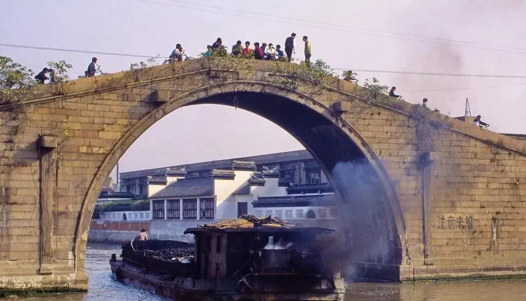 这个大弧度的桥就是石拱桥,青石板被鞋底磨得亮,桥身侧面刻着注意来往几个字,黑烟从桥洞里滚出来,像给岁月抹了层灰,桥顶的年轻人盘腿坐着聊天,估摸着谁先喊了一声,船来了,大家便起身往下看,仿佛一出戏要开场。