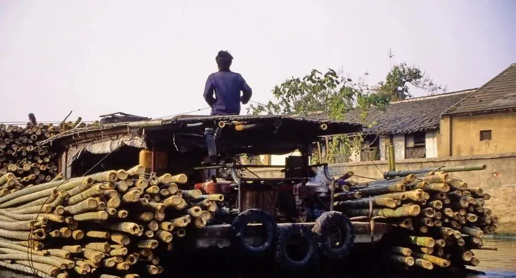 这船上装的是毛竹,两侧绑得密密匝匝,截面一圈圈年轮清得很,船顶搭了个小棚,师傅背手站着眺河道,嘴里叼着烟,风一吹烟灰斜斜地掉,他抬脚跨过一捆竹,低声说一句,今朝再跑一趟就收工,话被机器声吃进肚里了。