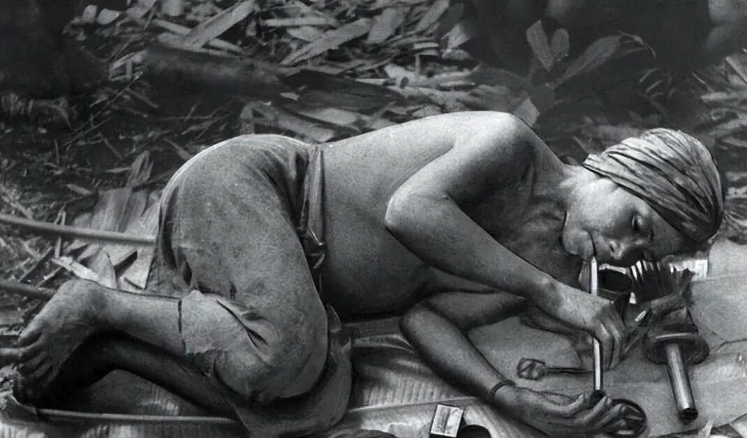 这个枕头不是枕头,是一块毛糙的砖,长凳当床,脚边是一套小铁具,壶嘴细长像鸟喙,男人眯着眼,指尖的茄汁色是常年留下的痕,起初还擦,后来懒得理,能攥着烟枪就行。