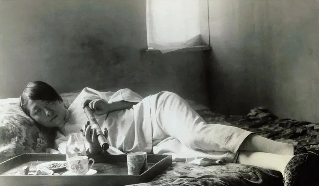 这位靠在枕边的女子手里拿的也是烟枪,床头那个木托盘摆着小茶杯、糖盅、烟灯,窗子透进一点清亮,照得脸色更白,茶水是醒神用的,真要醒过来却难,妈妈说以前人家闺秀也迷这个,衣裳再素净,骨头里也要打颤。