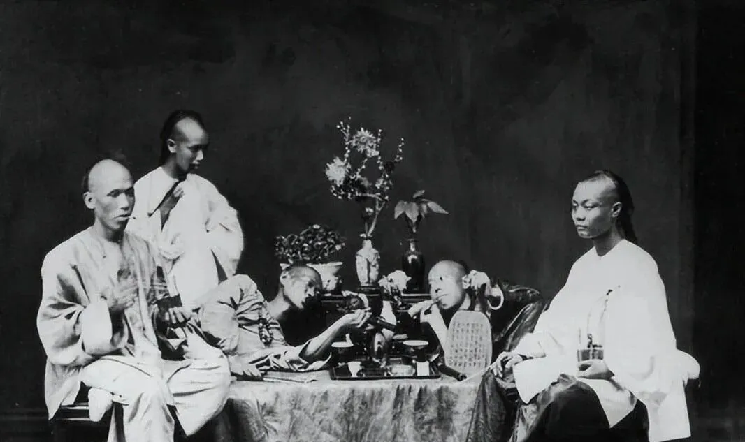 这张看着体面,其实也是烟馆,桌上花插、文房、点心碟摆得周正,两边人一左一右服侍,主位的人袖子宽大,面色发白,手却在抖,镜头里俱全,气却虚得很,那个年代喜欢留影留脸面,转头还是要补一口。