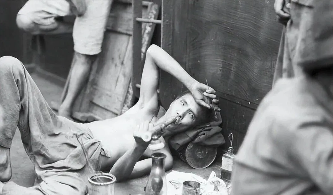图中当枕头的那截方木叫枕木,冰凉硬邦邦,老头的眼镜压在鼻梁上,镜片后头是空洞的眼神,旁人扶着枪嘴凑火,黑墙上挂把簸箕和破大衣,屋小灯弱,人躺着就不想起来,奶奶说过去谁家炕头要摆上这套,日子八成就往下坡走了。