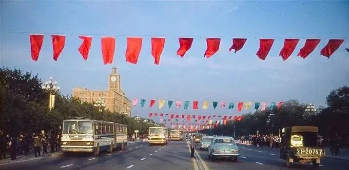 图中这一溜儿迎风招展的红旗,就叫彩旗阵,挂在长安街的高空钢丝上,节庆一到就全城热闹起来,旗面是亮闪闪的化纤布,红得正,边角被风卷出半月形的弧,下面是公共汽车轰隆隆地开,车身奶油白配浅绿,车窗里的人挤挤挨挨,妈妈那会儿说,站在路边看车流就像看河水,永远不停,永远往前走。