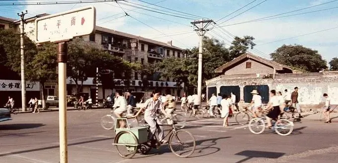 这块写着木樨地的搪瓷指路牌,边框是铁皮包口,牌面被太阳晒得微微发黄,路口四散的电线像黑色的蛛网,自行车像潮水一样扑面而来,前面那辆车后座绑着一只绿色木箱,里头是修理匠的家当,扳手、补胎胶、水盆一应俱全,他一按铃,叮的一声就过去了,现在路口全是红绿灯和等候线,以前靠眼神,靠默契。