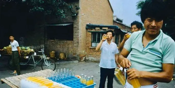 这个蓝格塑料箱里码着的玻璃瓶叫北冰洋汽水,瓶身细长,肚子上印着橙色小海豚,开盖器一撬,嘶的一声冒白气,冰凉的甜味儿顺喉而下,咂嘴才回魂,摊主把空瓶往箱里一搁,叮当脆响,小时候我喝一口就被爸夺过去,说小孩儿牙嫩,喝两口意思意思就行,旁边三轮车上堆着刚摘的西瓜,瓜蒂冒青水,切开是沙红的瓤,围着人就多了。