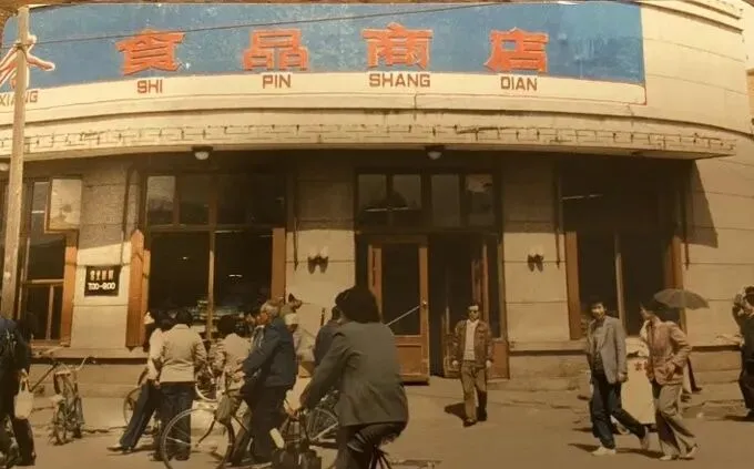 这个写着食品商店的大门,就是我们家那会儿的“冰箱”,夏天进去能闻到凉气里夹着酱油和糕点的混合味儿,门上装着弹簧合页,进出都要被轻轻带一把,门口常年靠着几辆二八大杠,爷爷说两毛一两的切糕要趁新鲜买,回家用搪瓷碗扣着,第二天还香,柜台后面的阿姨戴着白袖套,剪票、找零,一套动作干净利落。