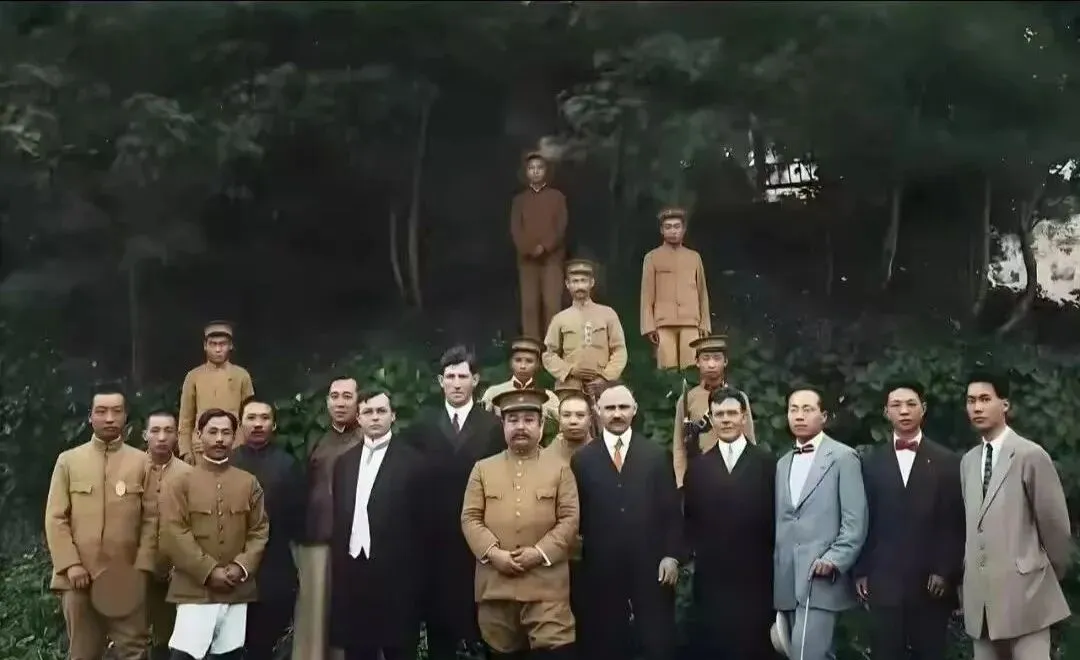 图中这张叫团体合影,背景是深色树林,人都挤在前景一字排开,军装长衫西服凑成一片密密的颜色,站姿各不相同,最显眼的是前排中间那位圆沿军帽,一双手在腹前交叠,镜头往上一抬,后排还有几个站在台阶或土坡上,层次分明,摄影师不按常理出牌,把人堆出高低错落的味道,像是在刻意留白历史的侧影。