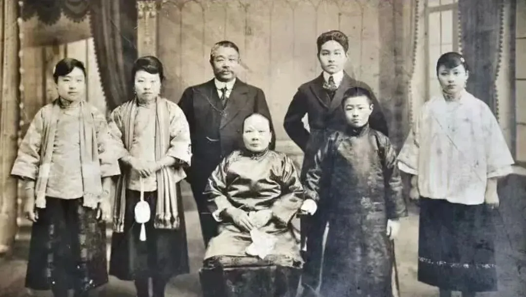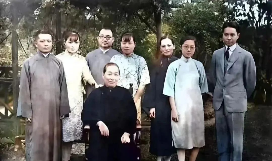 这张叫庭院合影,后景是木栅与树影,衣着一下子细致起来,旗袍领口的滚边、长衫的暗纹、眼镜的圆框,都被镜头老老实实记下,坐着的长辈神色安定,站着的年轻人微微前倾,像要靠近一点儿,场面不喧哗,却有一种慢慢盛开的安静。