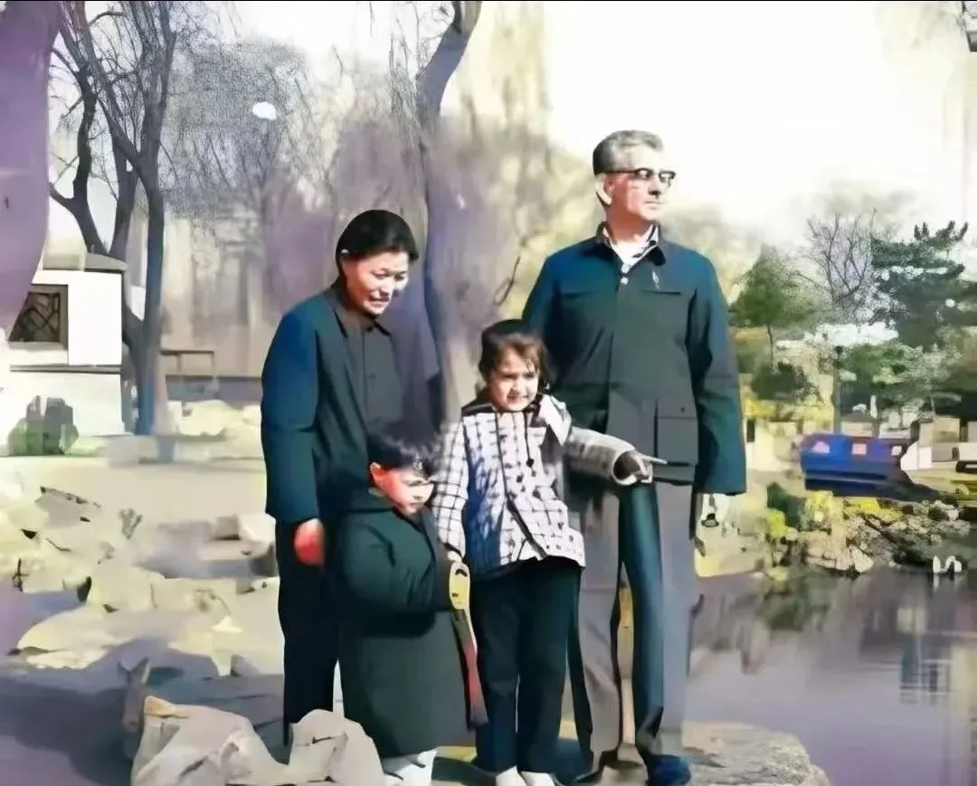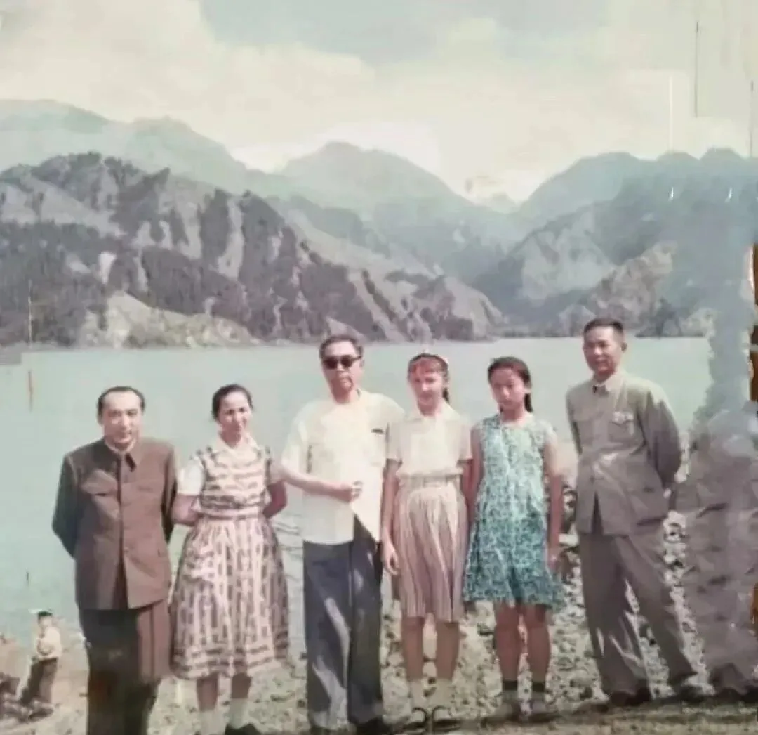 这一张是湖石边的家庭游照,小姑娘指着水面,像在问那条小船去哪儿了,大人笑着点头不急着回答,风把树影吹碎在湖面上,七八十年代的蓝呢大衣有点硬挺,袖口挽起半寸,口袋里装着折叠地图或糖纸,妈妈说那时出去玩要带暖水瓶,路上停下倒一杯,烫嘴也要喝。