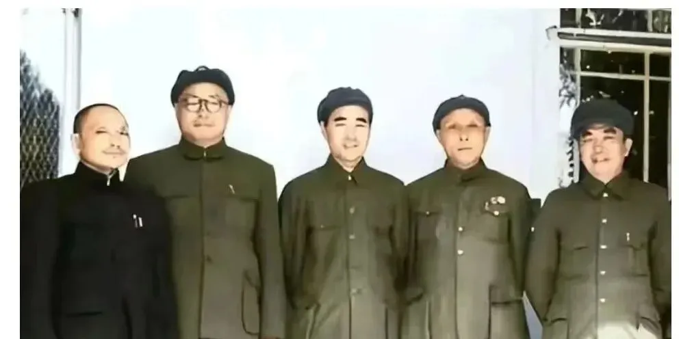 这张是门廊边的并肩照,几位穿着墨绿军便装,胸口两枚勋表在阳光里一闪,最左边那位穿的是立领黑长衫,神气一点不输,背景是白墙和窗格,影子斜着压下来,构图紧凑,站位挤出一种肩并肩的劲头,沉默里有默契,一句话都不用多说。