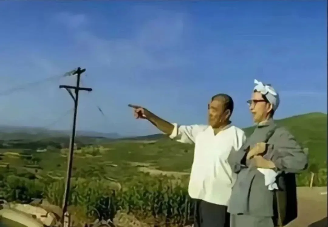 最后这一张,指着远处的手指最抢镜,电线杆斜斜立着,远山被午后的光晒得发白,右边这位肩上挎着布包,额头绑着手巾,步子还没迈出去,话头先抛过去了,那时候外公常说你看那块梁地,得修一道渠,水顺下来,地就有了活气,现在我们看地图用手机一放大,河渠脉络全出来了,可指点江山的兴奋劲儿,还是这张老照片里最真。