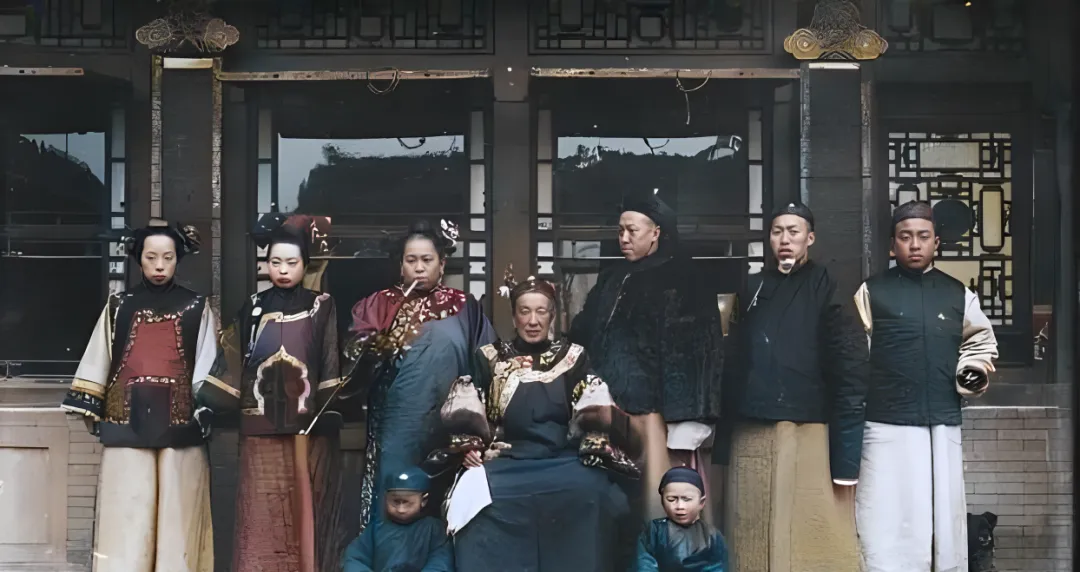 图中摆在正中的老太太叫主心骨,一身暗蓝团龙袍面料的常服衬着金边披肩,手里搭着绸面帕子,身段不高气势却满格,左右一圈人围着她站,就像堂屋里摆供的位次一样不敢乱,右侧老大头戴乌纱顶戴花翎,外罩紫貂端罩油亮得像刚上了蜡,两个弟弟穿瓜皮帽配绵马甲低调许多,左边三位儿媳里,长媳咬着铜嘴旱烟袋,指节上的银指环闪一下就灭,像给镜头亮了个招呼,两个小孙子穿蓝布短襟,站得直直的,镜头前不笑也规矩,奶奶那会儿常说,拍照要稳住神,别乱眨眼,不然成片糊得像做梦。