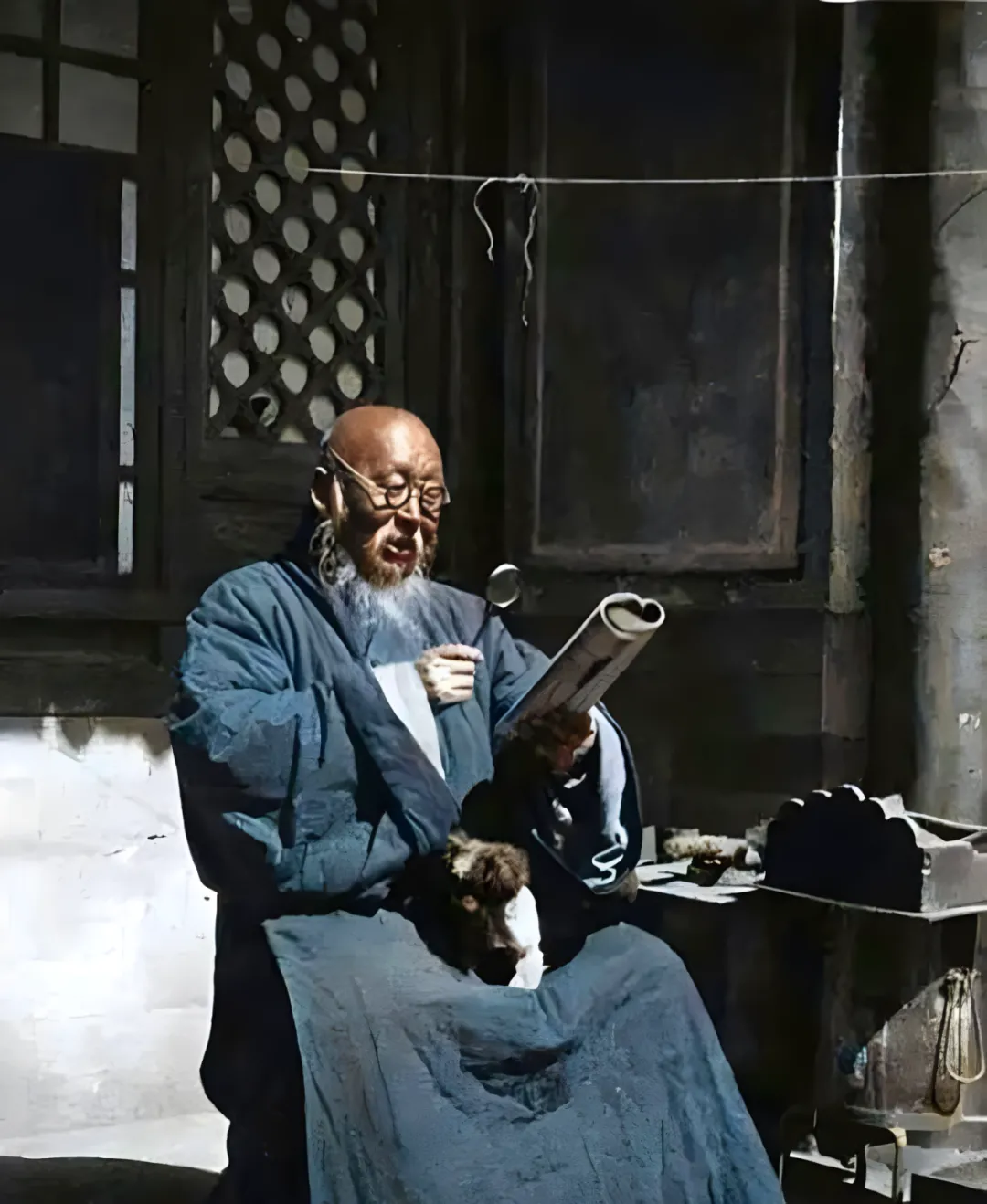 这个坐在日头底下的读书人叫老花镜大爷,灰蓝长袍肥肥地搭在膝上,左耳勾着细绳,镜片泛着旧油光,手心里多了个小圆放大镜,像扣在字上找宝,太阳从窗格缝里照下来,书页被烤得发亮,他把卷角轻轻抹平,嘴里哼一声接着念,奶奶说那会儿屋里点的菜油灯抖啊,风一窜就跳火苗,眼睛跟着受罪,还是搬个小凳往外头一坐省心,他背后的窗棂是菱格木窗,边角磨得发白,像被很多只手摸过,想想现在随手开灯屏幕一亮,字大得能装满一面墙,以前看一行字得挪半天,现在一句话刷一下就过去了。
