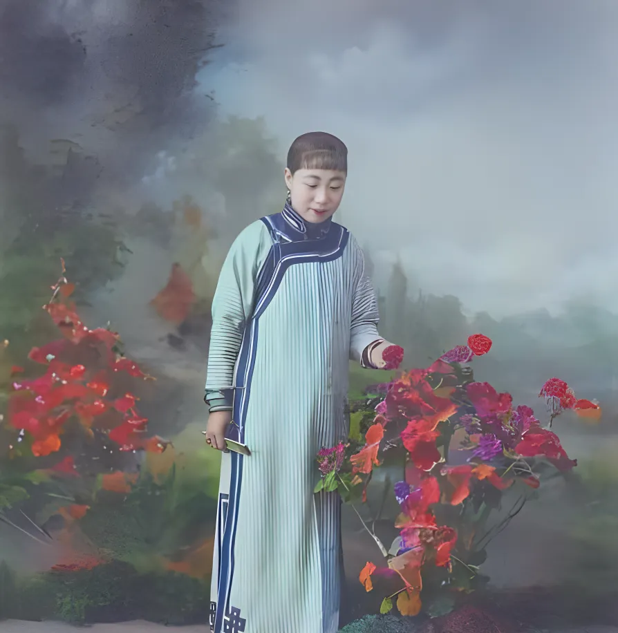 这个发型叫前刘海,齐齐地压住眉尖,像把嫩柳芽儿一剪齐,她手里拈着一枝红花,指甲涂的不是油,是被肥皂水泡白的那种干净,身上穿的是立领改良袄裙,边线绕着深蓝滚条,一抬手袖口的盘扣亮了一下,照相馆给她摆了团扇和花盆道具,站位斜半步,眼睛别正看镜头,师傅说这样显脸小,妈妈笑我小时候剪过一次歪刘海,铜尺一比手一抖,成锯齿了也不怕,乱刘海照样能出门,现在烫染随手预约,以前烫钳得先在炭火上烤热,滋的一声,发型与烫头皮只隔一线。
