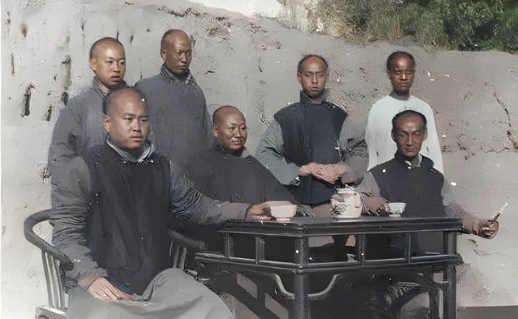 清末上色老照片:地主坐方桌,管家随侍;八旗老头穿黄马褂晒太阳;拈花拍照的年轻女子;头戴毗卢帽的喇嘛。
