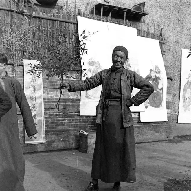 喜气洋洋的上海老百姓。身后是一幅幅的中国传统年画,当年过年是要贴年画的。