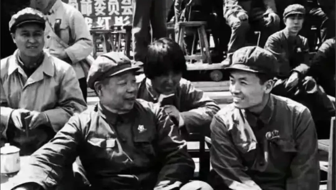 图里这排长板凳叫临时评比台,灰蓝色棉布帽,旧呢料衣裳,茶缸边上还蹭了印子,最左边的人笑着侧过身,旁边的小青年眼睛亮亮的,像在追着话头问个不休,小时候我就爱蹲在这种场院台阶旁,看大人们你一言我一语,褂子袖口一挽,手往空中一画,比划出来的都是日子里的门道。