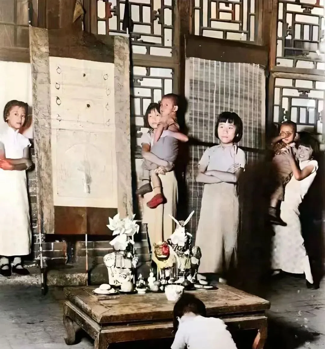这张院子里的摆设很讲究,方桌上供着桂花、白兔、柚子,孩子们抱着弟弟妹妹,站在屏风旁边抻脖子看,墙上贴了画,烛光摇摇晃晃,中秋的月亮还没上来,团圆的心气儿先到了,以前过节是把日子“摆出来”,现在是把节日“点进手机”,图个方便,味道却淡了点。