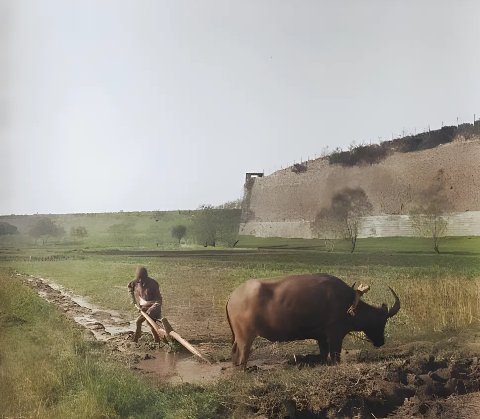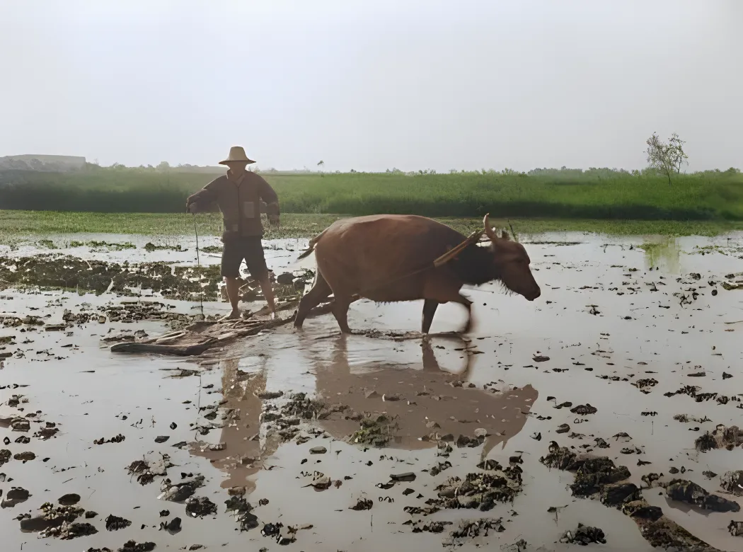 城墙外这一畦一畦的稻田,沟埂像掌纹,牛喘气热腾腾的,男人握着犁把子,脚背上糊着泥,太阳才往上爬一点点,人影却已经在田里拉长了,爸爸说,那阵子天一亮就下田,月亮出来才回家,现在看手机点点就能知道雨情墒情,那时候就看天看风看泥色,两只眼睛全用在地里了。