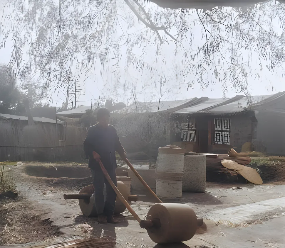 这对圆滚滚的叫石碾,灰白石头磨得发亮,木把手一推就转,压苇子压芦杆,咔啦咔啦的声儿清清脆脆,邻家婶子会把压好的苇席晾在墙根,阳光一晒,草香直往鼻子里钻,小孩子在旁边偷摸着坐上去,被大人一吼,赶紧跳下地。