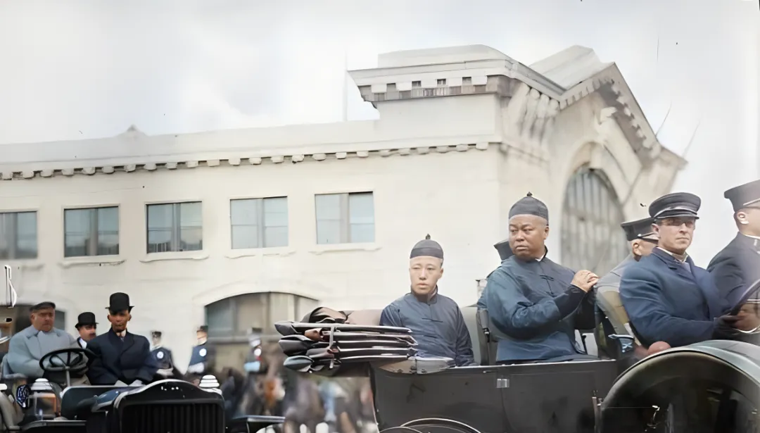这张是开敞篷车上的合影,前排靠背叠着几床呢毯,后排坐着载涛,脸圆圆的,眼角往前一瞥,车身漆黑发亮,周围穿制服的洋人站得直,背景是大片白墙的楼,边角带点弧线,看着就像营房。