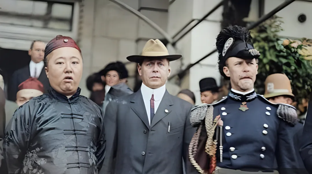 这个画面里站成一排,左边黑缎长衫的还是载洵,中间戴毡帽的洋面孔,右边穿军礼服的胸前一排银纽扣,肩上斜一道白带,帽檐插羽饰,光看边幅就知道规矩不小,三人肩并肩,脸色各不相同,镜头按下去,瞬间就凝住了。