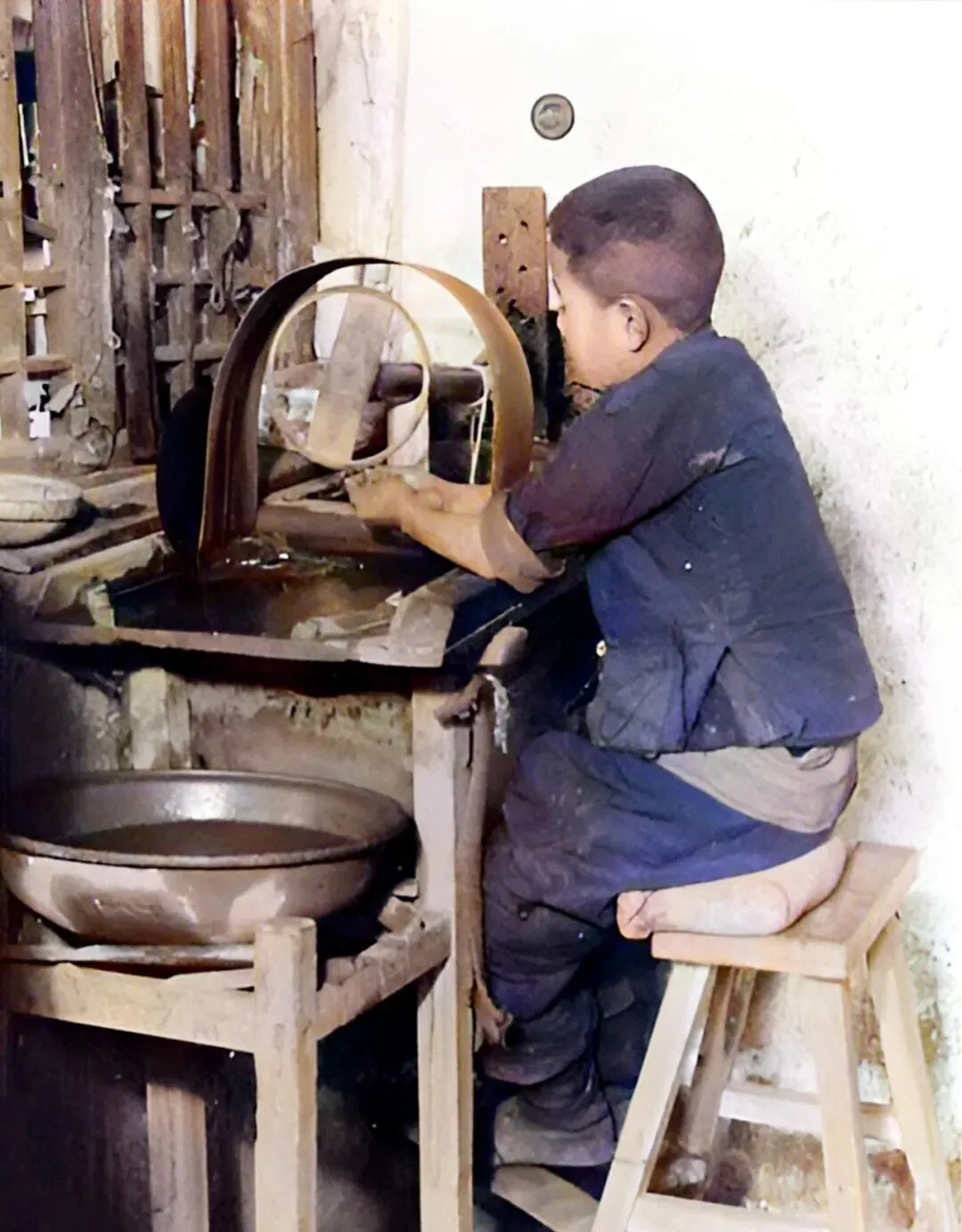 这个小小的工作台前那一圈圆轮叫砂轮,木凳子垫着厚棉垫,孩子脚都够不着地,袖口湿漉漉的,手一送一收,砂粒嘶嘶作响,师傅骂一句他就瑟缩一下,那时候,小手先学的不是写字,是蹭火花混口饭。