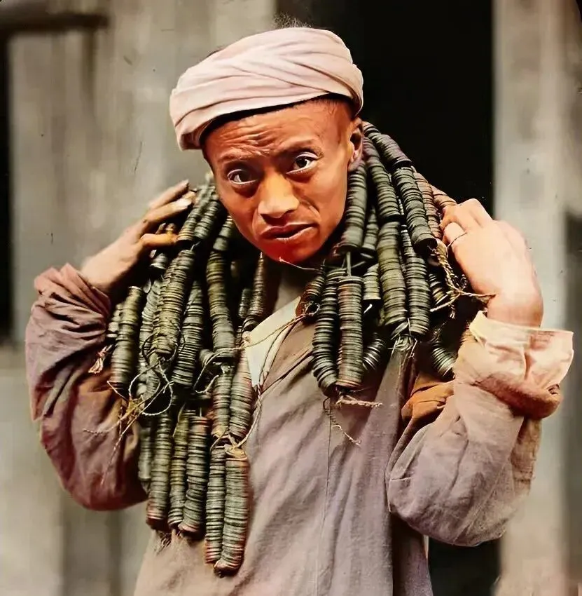 这位肩上缠满的叫铜钱串,一圈一圈沉得慌,看着像财主,其实买不了几样东西,通货贬得快,走两条街就掉一串,叮当声多,分量却轻。