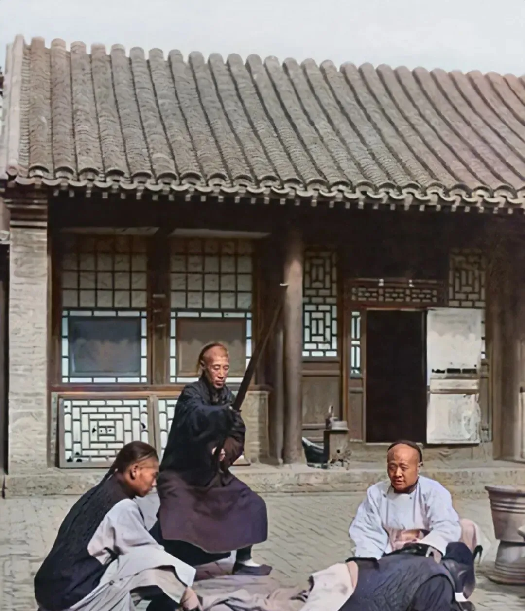 这位手里举着的长板叫令牌,亮油油的边角磨得溜圆,嘴里衔着烟,眼神冷得像刀,围观的人不敢出声,只听见铜扣子叮当响,谁被唤到名,腿就软了。