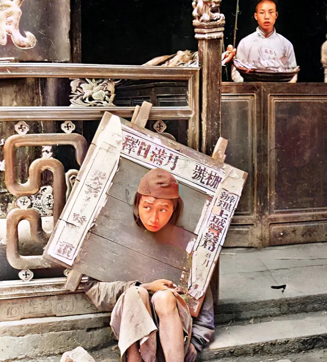 这个大方框套脖子叫木枷,上头写着一堆字,走路得歪着身子挪,肩膀很快就破皮,旁边掌柜端着盘子若无其事,别人的灾祸,在看客眼里就是新鲜。