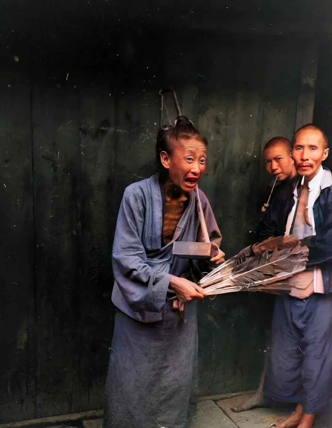 图里这把乱糟糟的羽扇不为乘凉,是街头艺人当道具吆喝的,旁边人抽着旱烟,笑出声又忍住,小时候见过类似场面,心里发堵,拿人的苦难当乐子,最刺骨。