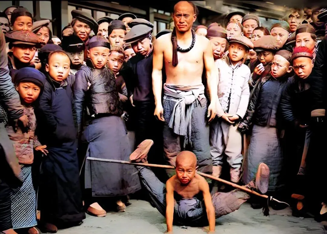 地上那根扁担架着腿,孩子硬撑成字形,人群围一圈,铜板落地当当响,师父脸上抹着油彩,鞭子挂腰间,夜里收摊一身伤,能靠手艺吃饭已是本事。