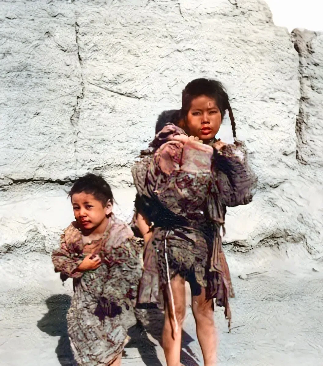 这对小娃手里端的是搪瓷碗,碗沿有裂纹,汤面上只一层薄油,衣裤补丁摞补丁,寒风里鼻尖通红,吃一口就哈气,能吃饱是奢望,不饿肚就是幸福。