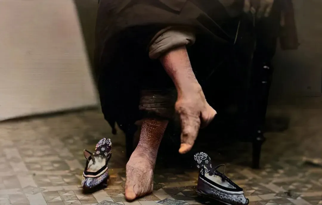 这双小得可怜的鞋叫绣花弓鞋,脚趾被硬裹到掌心,后跟磨得像老树皮,走路一点点挪,奶奶说她娘年轻时也缠过,解开布条哭了一夜,小脚不是美,是苦。