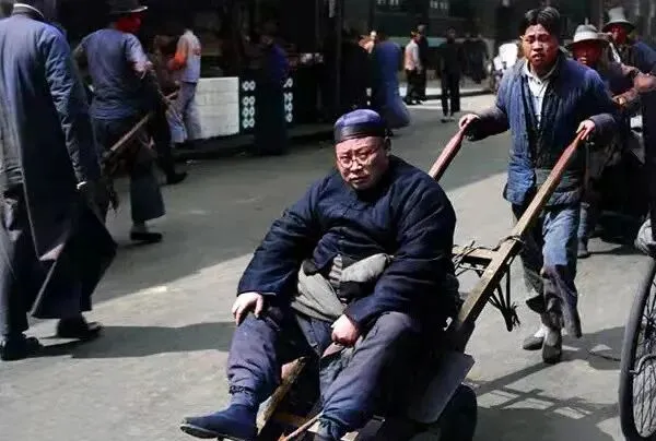 这辆木把的叫板车,前头人喘得肩膀一抖一抖,后头那位还翘着腿,阳光落在青石板上,一明一暗,师傅回头瞟一眼也只能咬牙,力气就是饭碗,没得讲理。