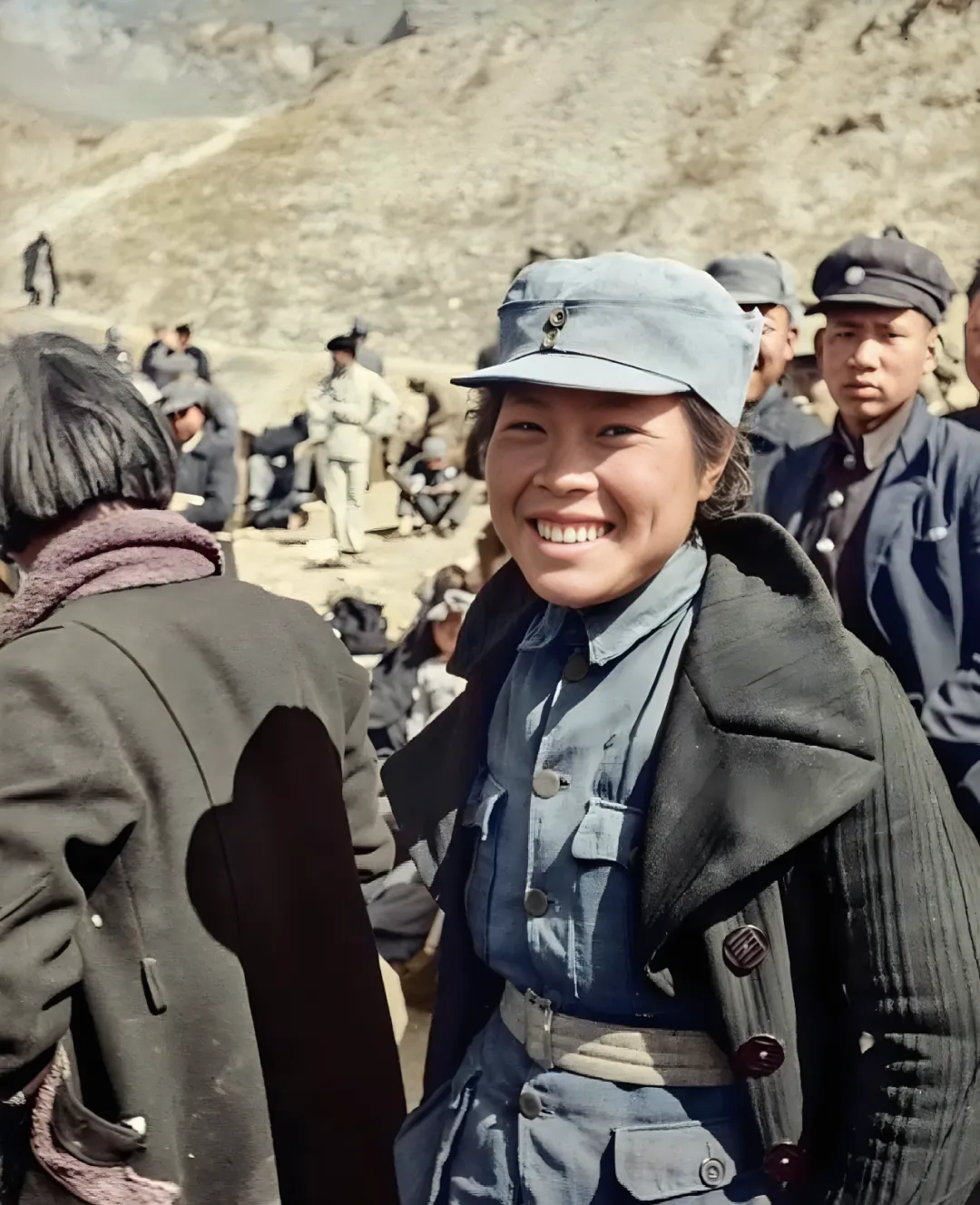 图中这位女学生叫八路军军政大学学员,蓝灰军装贴身合体,铜扣一粒粒亮着,腰间布带打个结,帽檐压得低低的,笑起来露出虎牙,可精神了,我第一次看到这张时心里一暖,笑声仿佛能在窑洞口回荡开去,山风一吹,呢子大衣的领子往上翻,肩头那点旧补丁也不藏着掖着,正大光明地亮着。