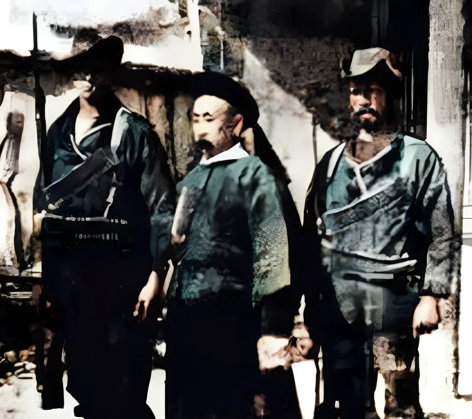 这张模糊的上色像里,叫作清末官员的三人影,团龙补服隐约泛青,乌纱帽的边缘被阳光烫出一道白印,脸部被老化的底片咬得发糊,反倒让人更在意那身形的挺直,旁边两位穿青袄的兵丁手上像还扣着绳索,场面不必多说,空气里自带一股肃杀味儿。