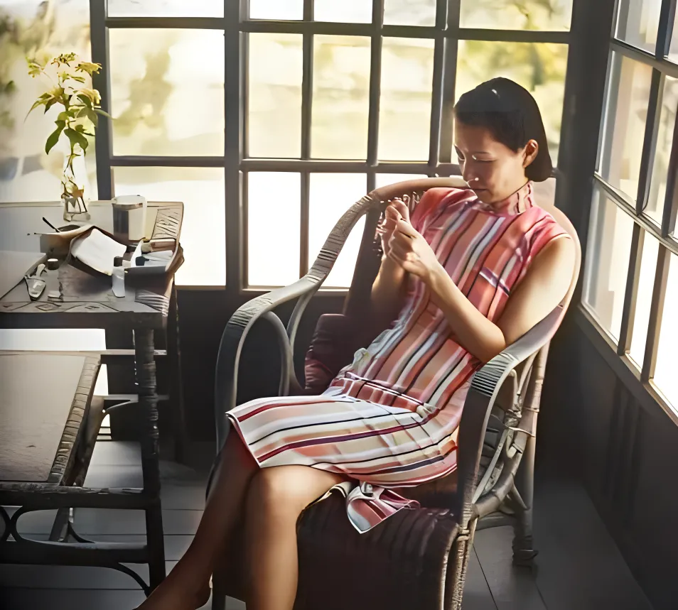 这个优雅的身影叫条纹旗袍的太太,藤编摇椅窝着人,指尖正抿着指甲油,条纹一明一暗顺着身形走,腰线被轻轻一勒,窗格投下碎光,桌上那只玻璃瓶插着月季,花影在桌面上晃,像一口浅浅的叹气。