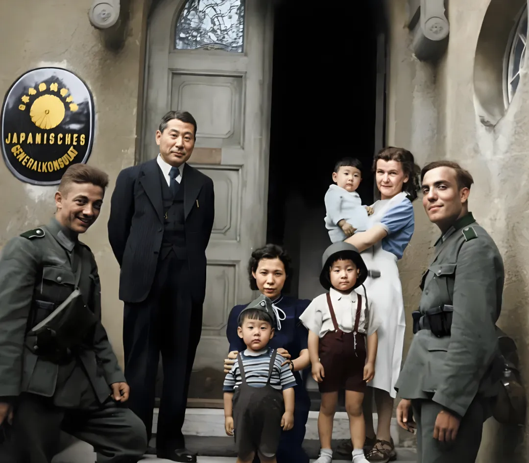 这张合影叫领事馆门口的家庭照,木门斑驳,左侧挂着金色徽章,站着两名穿军服的年轻人,笑得有点拘谨,孩子戴着小帽子,裤带勒得挺高,抱孩子的女士胳膊上系着白围裙,男主人收着下巴,像是在认真配合摄影师的指令,表情里却透出一丝子不安。