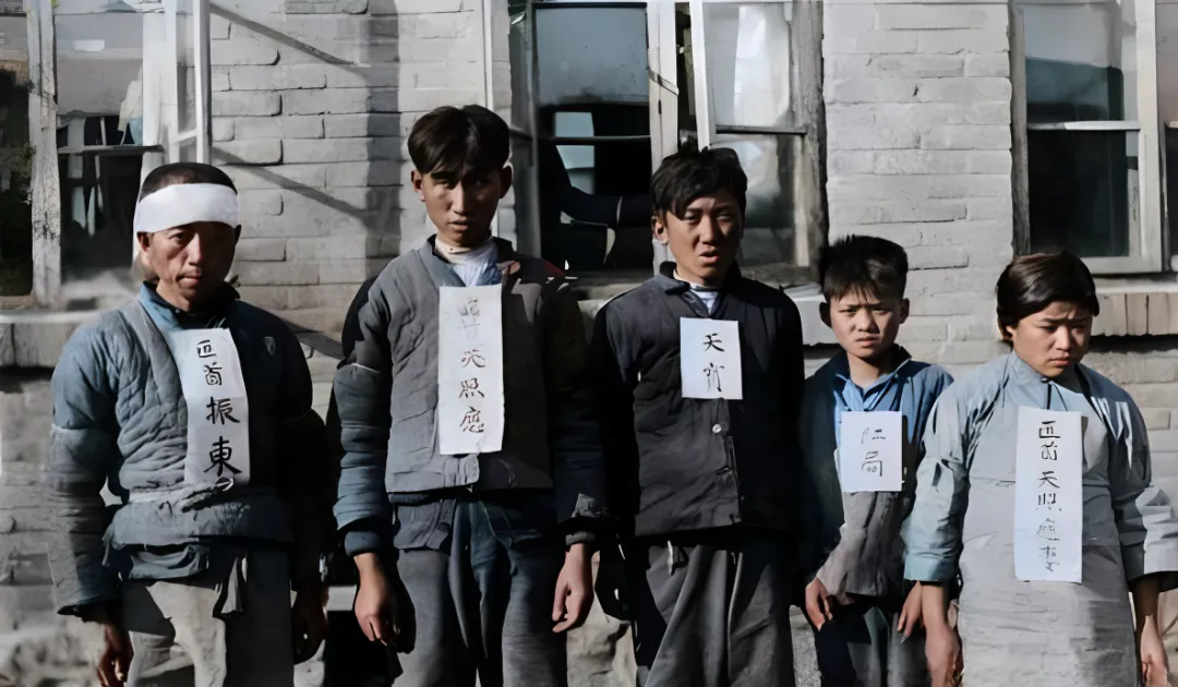图中胸前挂牌的人叫被“栽赃”的普通百姓,粗棉袄褪了色,灰蓝一片,牌子用白纸剪成长条,黑墨字歪歪扭扭钉在棉扣上,风从窗缝里灌进来,纸角抖了两下,他们站在砖房檐下不敢动,左边那个头还缠着纱布,显然挨过一顿,场面看着就硬邦邦的凉。