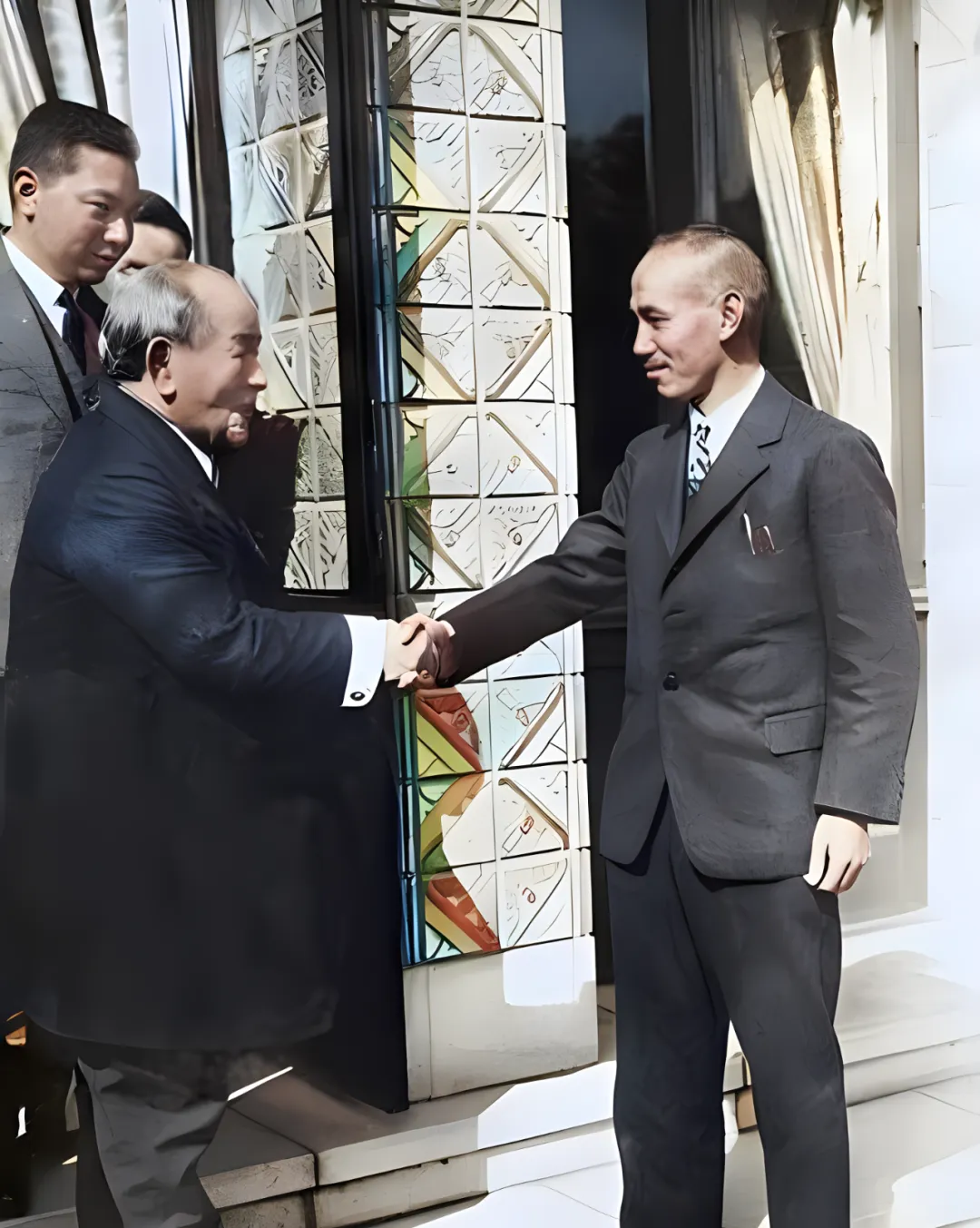 这张门口的礼貌动作叫握手,右边的人西装口袋里插着一支钢笔,扣子只系了一枚,左手空着微微下垂,门边的瓷砖拼成彩色几何纹,像糖纸一样亮,站在台阶上的人圆脸微抬,笑意不大,旁边随员探出半个肩膀,仿佛要听清每一个字。