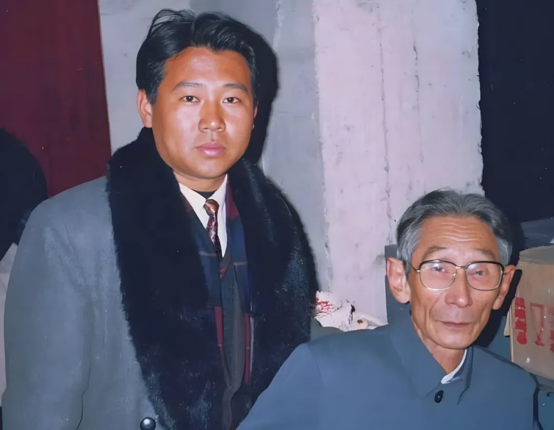 这张并肩的老照片叫舞台边的传承,年轻人西装打底,外罩一件黑色毛领大衣,领带压得正,眼神挺直,旁边的老先生穿一身蓝灰中山装,镜片薄薄的,颧骨清楚,袖口处起了些许亮光,背景是冷墙和纸箱,简陋得很。