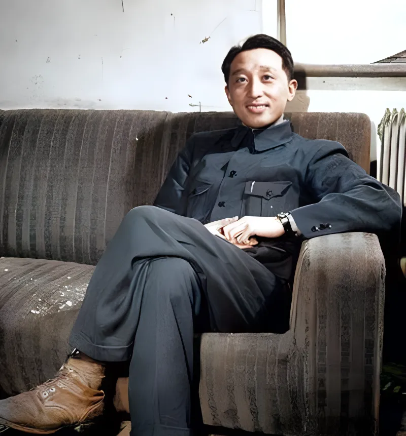 图中这位坐在旧沙发上的人叫一身挺括的中山装,藏青色,四个口袋扣得整整齐齐,脚下那双皮鞋边缘磨白了,沙发靠背被磨出一片斑驳,墙角的暖气片露出几根铁管,他把腿搭起来,手腕上的表亮了一下,嘴角往上挑了不多,十五度刚刚好。